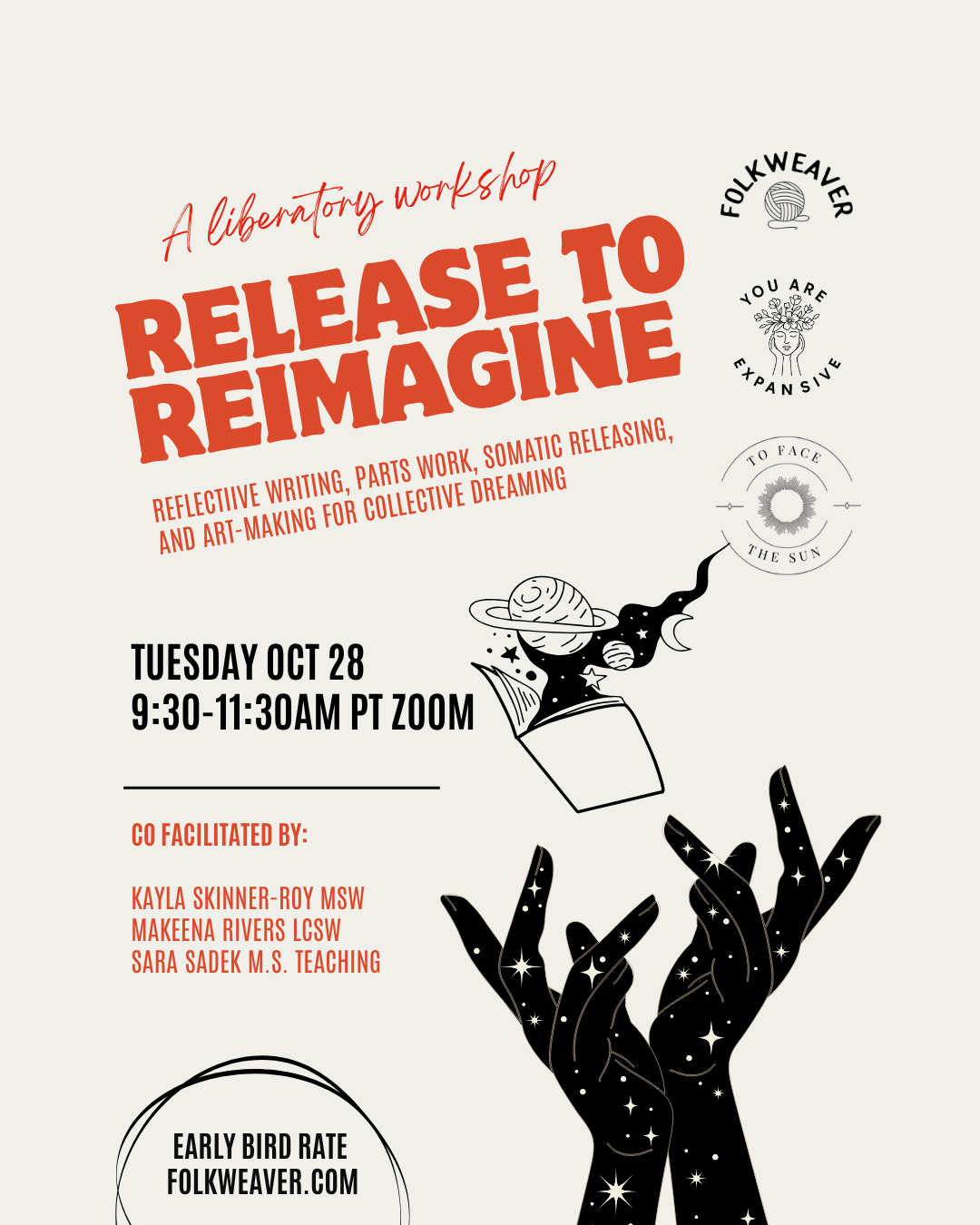 All (PRE-ORDER BUNDLE) Platonic Co-Parenting: Reimagining Nuclear Family (zine + digital) $35.00 (PRE-ORDER ZINE) Platonic Co-Parenting: A Guide to Subverting the Nuclear Family (Limited print) $25.00 (DIGITAL) Platonic Co-Parenting: A Guide to Reimagining the Nuclear Family $15.00 Release to Reimagine Workshop (early bird rate!) Sale Price: $45.00 Original Price: $65.00 Sale Fall Equinox Digital Seasonal Calendaring Zine $10.00 (SOLD OUT) Fall Equinox Calendaring Zine Limited riso printed zine $22.00 Sold out Digital Download: Folkweaver's Guide to Reparenting our Inner Child (journal + meditations) $20.00